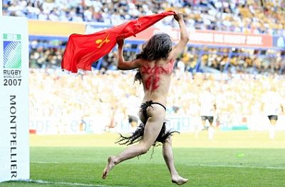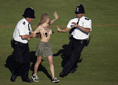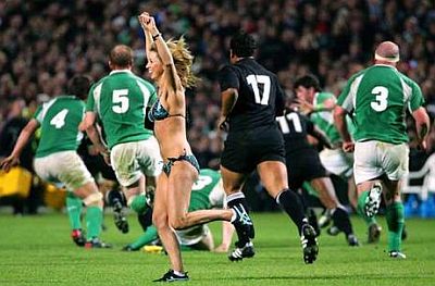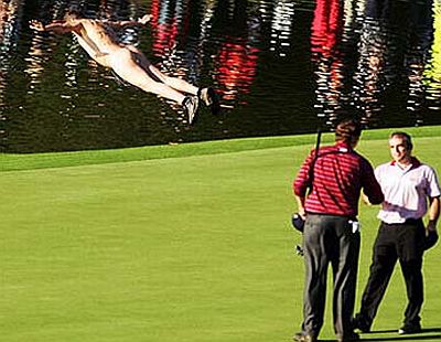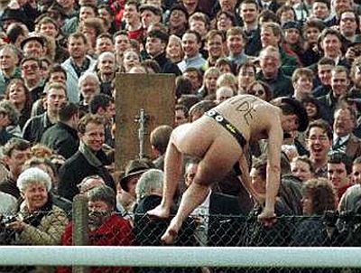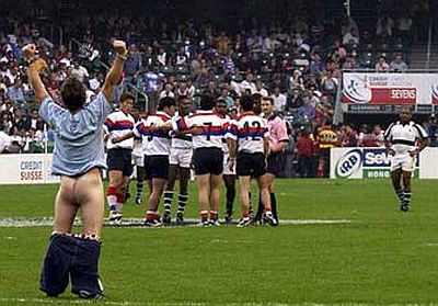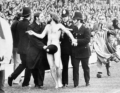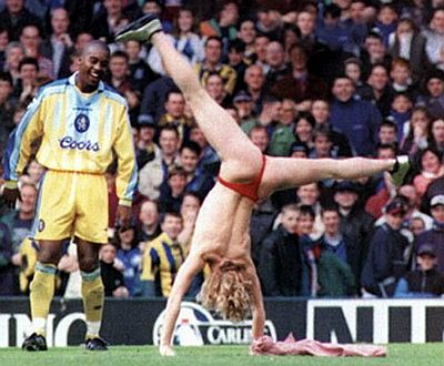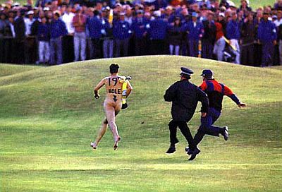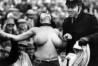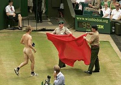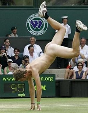 Fenomen poznat kao streaking, odnosno skidanje na javnom mjestu, posljednjih godina javnost veže uglavnom za sportske terene, a streakeri su ta mjesta upravo odabrali kako bi se zahvaljujući prisustvu kamera i fotoaparata prikazali što većem auditoriju. Osobito plodno tlo "streaking" je našao u Velikoj Britaniji, posebice na teniskim i golf terenima. Od prvih zabilježenih pojava, sedamdesetih godina prošlog stoljeća do danas taj se "pokret" i komercijalizirao pa nerijetko streakeri koriste priliku kako bi natpisom na svojim leđima izreklamirali onoga koji je to spreman platiti. U međuvremenu su, primjerice, usprkos konzervativnim organizatorima, postali dio wimbledonske tradicije. Stoga ćemo upravo početi s jednom od najlegendarnijih fotografija streakera, snimljenom u Wimbledoneu (obratiti pozornost na lica tenisera koji promatraju nagu Melissu Johnson) ...