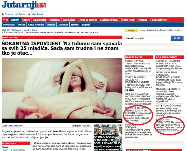 U trenutku pisanja ovog teksta među top preporukama je bila "ŠOKANTNA ISPOVIJEST 'Na tulumu sam spavala sa svih 25 mladića. Sada sam trudna i ne znam tko je otac...'", a posebno istaknuto mjesto pripalo je i nekima od najčitanijih vijesti kao što su: "POLICIJA OBJAVILA VIDEO: ZLOČIN NA FLORIDI Dvojica silovali djevojku na plaži prepunoj ljudi, nitko joj nije pomogao" te "FOTOGRAFIJA IZAZVALA ODUŠEVLJENJE Dobro pogledajte, iznenadit ćete se kad shvatite o čemu je zapravo riječ", članak kojemu su centralna tema strije na preponama 29-godišnje manekenke. No, stvari su nešto čupavije kada se senzacionaliziranje crne kronike preseli na domaći teren.