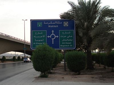 Na putokazu se, osim sveprisutne Meke (nadvožnjak na lijevoj strani zapravo je "Bab Makkah" odnosno "Put za Meku" i internacionalnog znaka za središte grada, primjetit ćete i strelicu za ulicu koja nosi ime Ali Ezzatbigovech Street. Za one koji nisu upoznati s činjenicom da je "transliteracija" iz arapskog u latinični alfabet (i obrnuto) stvar "osobne interpretacije", kao i da ne postoje standardna pravila (okej, nešto jesu pokušavali napraviti na tu temu, ali pošto je s Arapima nemoguće izaći na čistac, sve je ostalo na pokušaju), evo male pomoći.