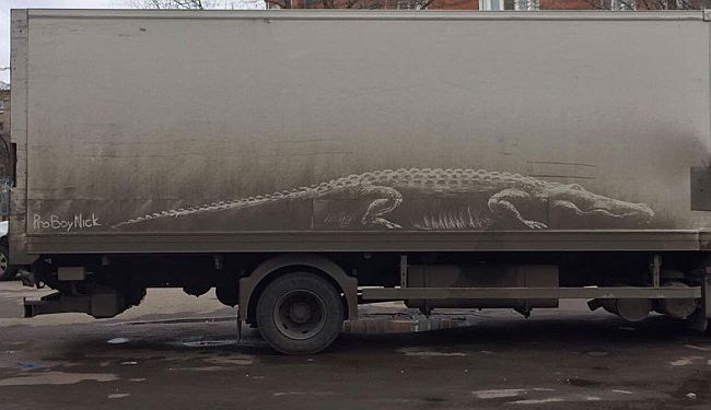 „Kad sam prišao svom kamionu ugledao sam nadimak i pomislio da su možda neki tinejdžeri opet napisali 'operi me'. Ali onda sam podigao pogled i ugledao prekrasan prizor – sovu – što me uistinu impresioniralo. Ne znam kako sad oprati tu ljepotu“, kaže vozač kamiona kojemu je svoju „posjetnicu“ ostavio Nikita Golubev, slikar, koji se proslavio svojim street art radovima.