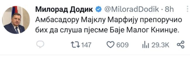 Twitter preporuka Milorada Dodika američkom ambasadoru u BiH (SCREENSHOT: Twitter)