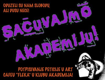 Pokrećemo potpisivanje peticije za očuvanje kluba Akademija, koja će moći da se potpiše u dnevnom Art klubu Fleka, kao i na društvenoj mreži Facebook. Takođe, pokrenućemo protestna okupljanja svih koji podržavaju opstanak kluba, u okviru kojih će nastupati svi muzičari, pesnici, likovni i dramski umetnici koji su gradili i još uvek grade neponovljivi duh Akademije.