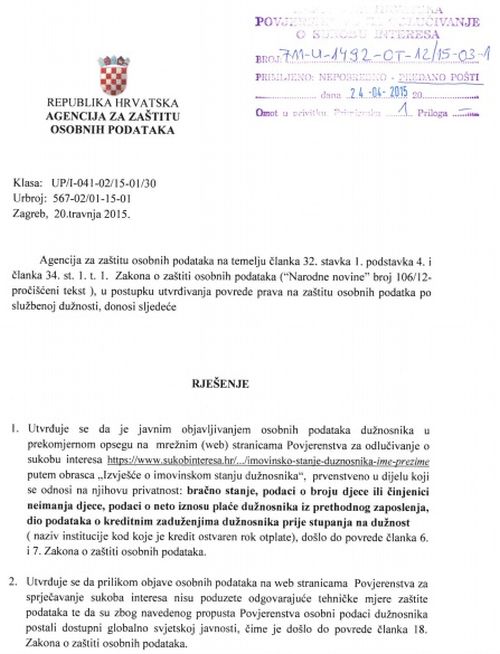 Agencija za zaštitu osobnih podataka je, naime, utvrdila da je objavljivanjem određenih podataka iz izvješća o imovinskom stanju dužnosnika na internetskim stranicama Povjerenstva za sprječavanje sukoba interesa, ta institucija povrijedila Zakon o zaštiti osobnih podataka te im se zabranjuje javna objava podataka o bračnom stanju, broju djece, neto iznosu plaće dužnosnika iz prethodnog zaposlenja i dio podataka o kreditnim zaduženjima prije stupanja na dužnost - naziv institucije kod koje je kredit ostvaren i rok otplate.