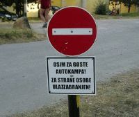 Tako je meni (pored već spomenutog dugog niiiiiiza stvari) u oko i objektiv uletio ovaj znak, a koji evo predlažem za nagradu Turističke Zajebnice grada Kaštela, pa i Hrvatske. Aha, nisam najvažnije rekao, znak se nalazi pred ulazom u kamp, dakle, samo pred kampom, a lijevo se može u hotel, bez ograničenja, možete čak biti i stranac i neće vam biti ULAZZABRANJEN.