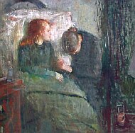 ednjem, opsesivnom autoportretu, nazvanom Između sata i postelje, stari Munch slika sebe kako lebdi na rubu vječnosti; ali njegova ruka sigurna za apstraktnu boju i strukturu pokazuje da on nikad nije gubio vezu s novim eksperimentima.