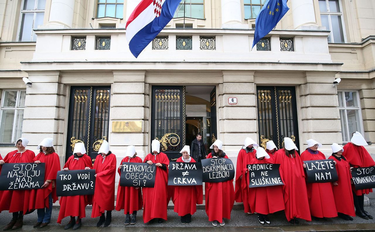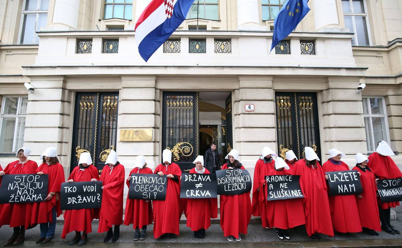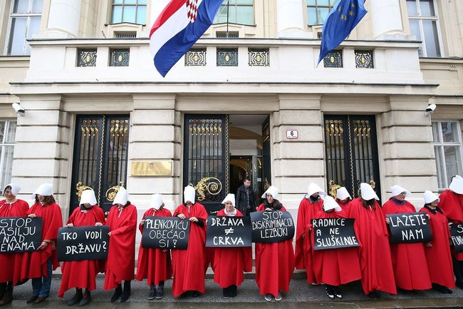Ženska mreža Hrvatske, Autonomna ženska kuća Zagreb, Lezbijska grupa Kontra i Domine Split organizirale su prosvjednu akciju pod nazivom "STOP fundamentalističkom nasilju nad ženama" na Trgu svetog Marka u Zagrebu i na Narodnom trgu u Splitu. Zatražile su hitnu ratifikaciju Konvencije Vijeća Europe o sprečavanju i borbi protiv nasilja nad ženama i nasilja u obitelji. Napominjući kako su obučene kao sluškinje iz knjige, serije i filma "Sluškinjina priča", aktivistica Autonomne ženske kuće Zagreb Neva Toelle rekla je kako su žene stavljene u funkciju "reproduktivnog stroja, hodajuće maternice i poziciju sluškinja", a ne žele biti u toj ulozi. Smatra i da su obećanja Vlade jalova, kao što su u knjizi kanadske spisateljice Margaret Atwood, jalove i žene koje se stoga siluje i dodjeljuje njihovim gazdama. Ta "jalova obećanja" dovest će do većeg broja femicida, istakla je.