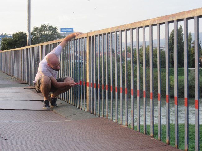 Arhitekt David Kabalin izveo je u subotu, 10. listopada, privremenu intervenciju u javnom prostoru iscrtavanjem crvene linije duž ograde Savskog (pješačkog) mosta koja najkraćim mogućim putem spaja i povezuje dvije obale.