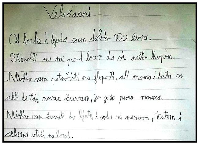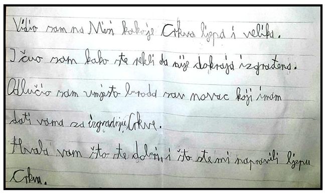 Na stranici je objavljena i fotografija pisma, u kojem nevještim dječjim rukopisom mališan poručuje župniku da će stotinu eura, poklon koji su mu pod bor stavili baka i djed, dati za obnovu crkve.