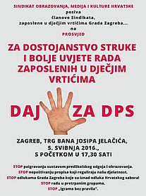 Sindikat obrazovanja, medija i kulture Hrvatske danas će, od 17.30 sati na Trgu bana Jelačića, održati prosvjed pod nazivom Daj pet za DPS (Državni pedagoški standard). Cilj ovog prosvjeda jest zaustaviti poigravanje predškolskim sustavom, nepoštivanje propisa i pretrpane vrtićke grupe. Organizatori prosvjeda poručuju da odluke Grada Zagreba ne mogu biti iznad odluka Hrvatskog sabora. Državni pedagoški standard u punoj je primjeni trebao biti već dvije godine, ali je u nizu gradova – uključujući Zagreb – ostao mrtvo slovo na papiru. U Gradu Zagreb, valja naglasiti, djeluje 60 gradskih i jednako toliko privatnih vrtića, pri čemu se već godinama ne rješava gorući problem broja djece u odgojnim grupama. Zagrebački vrtići broje čak 10 tisuća djece više od dopuštenog standarda, jer se sustavno godinama nisu planirali i razvijali kapaciteti sukladno stvarnim potrebama.