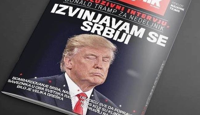 Nedeljnik “Nedeljnik”, Beograd, ekskluzivni intervju - Donald Tramp: “Izvinjavam se Srbiji; Bombardovanje Srba, naših saveznika u oba svetska rata, bila je velika greška; Uradiću sve da popravim haos koji su Klintonovi napravili na Balkanu”.