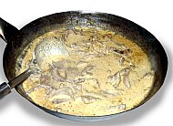 Dvije glavice sitno narezana luka na minimalno ulja, sa dodatkom mješavine začina i soli (neki to zovu Vegeta, neki Začinka) veselo je krčkalo u voku. Brzo sam narezal jetrice na tanke listiće i ubacil u vok, da delaju društvo luku. Jetrica su uskoro promijenila boju, ali je bilo premalo tekućine. Kao da čita misli, Ivor mi donese pivu. Pola ulih u vok, pola u sebe. Od začina dodah biber, zelenu, muškatov orah, malo lovora i dvije glavice sitno rezana češnjaka. Zanimljivo, ali češnjak i vrhnje se skladaju u ukusima, pa dodah i to. Polako miješam i čekam da zavrije.