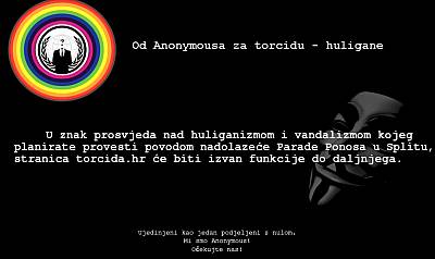 OTVORENO PITANJE TORCIDI: Oćete li sutra poštivat tuđu paradu ljubavi ili stat u kordon koji bi po takvoj paradi pljucao„U znak prosvjeda nad huliganizmom i vandalizmom kojeg planirate provesti povodom Parade Ponosa u Splitu, stranica torcida.hr će biti izvan funkcije do daljnjega.“, stoji u kratkoj obavijesti koja je izvorno upućena „Torcidi – huliganima“. U potpisu stoji tek „Ujedinjeni kao jedan podijeljeni s nulom. Mi smo Anonymous! Očekujte nas!“.