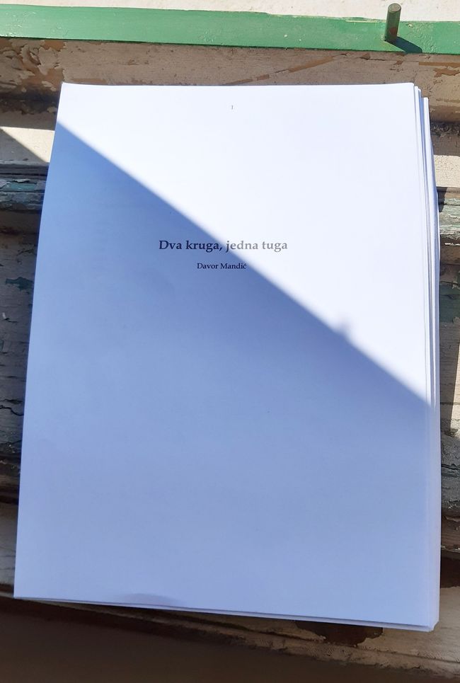 "Ova zbirka (već ju tako zovem, a ona to još nije) mjesto je konstantnog pregovaranja slučaja, intuicije i plana. Nešto kao život. Kad sam uzeo skoro pa kupus rukopisa i postavio ga na okvir prozora ne bih li ovjekovječio jednu, prvu etapu u nastajanju zbirke, sunce i sjena čudesno su pali preko naslovne stranice, raspolutivši i tako raspolućeni naslov na svijetlu i tamnu stranu, spustivši ga po silueti krova kuće (koji ima čak i mali dimnjak), kuće od jezika, jezika kao kuće bitka po Heideggeru. Nije nevažno ni to što sam u Facebook post kojim informiram prijatelje o tom minornom svjetskom događaju već bio stavio pjesmu koja se upravo na tu kuću bitka referira (a koju pjesmu i ovdje prilažem u izboru poezije, uz fotografiju). Tako je slučaj odigrao igru koja zbog uklapanja izgleda kao da je posljedica barem intuicije, ako ne i plana. Važno je to i zbog ideje zbirke u cjelini, koja polako, na kapaljku dobiva konture i koja će jednom, za nadati se, pod naslovom 'Dva kruga, jedna tuga', pronaći svoj nadtekst, svoju bit zbirke, i postati puno 'bolja' od svoga autora, onako kako je ova fotografija 'bolja' od svoje prve, skromne namjere."