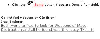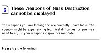 No, vratimo se mi onome što se dogodi u trenutku kada se osjetite sretnim baš dok pretražujete Weapons of Mass Destruction. Otvori vam se stranica koja podsjeća na onu iritantnu The page cannot be found, s tim da u ovom slučaju piše These Weapons of Mass Destruction cannot be displayed, što je ujedno i title samog sajta koji se nalazi na adresi http://www.coxar.pwp.blueyonder.co.uk/. Također je drugačiji i ostatak teksta, koji je šaljivog karaktera, na račun svjetske velesile, Sjedinjenih Američkih Država i nekolicine njenih najistaknutijih sinova.
