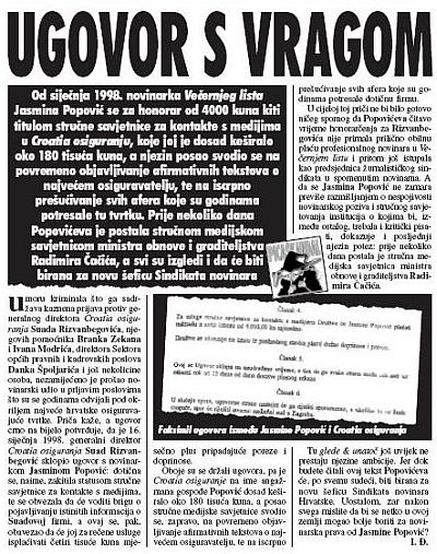 Činjenice govore ovako: novinarka Večernjeg lista Jasmina Popović 16. je siječnja 1998. potpisala ugovor s Croatia osiguranjem u kojem na sebe preuzima funkciju stručne medijske savjetnice sa zadatkom da vodi brigu o tome da se o "Društvu pravovremeno pojavljuju istinite informacije u medijima"; ta je briga koštala četiri tisuće kuna mjesečno, a sastojala se u objavljivanju afirmativnih tekstova o dotičnoj tvrtki ili u publiciranju razgovora s generalnim direktorom rečenog osiguravatelja Suadom Rizvanbegovićem. Tako se čudnim stjecajem okolnosti zbilo da su u razdoblju od siječnja 1998. do ožujka 2000. u Večernjem listu izišla tri intervjua s Rizvanbegovićem i u sva tri slučaja - koje li slučajnosti - s direktorom je razgovarala Jasmina Popović, osoba koja je, podsjetimo još jednom, 16. siječnja 1998. s istim tim Rizvanbegovićem potpisala ugovor u kojemu se obavezuje na širenje istine o Najdražem Osiguravatelju. E sad, je li gospođica Popović s Rizvanbegovićem razgovarala kao novinarka Večernjeg lista ili kao stručna medijska savjetnica Croatia osiguranja? Jesu li joj u tim trenucima intimnoga čavrljanja prožetog ozbiljnim i fingirano oštrim pitanjima mislima strujali ideali nezavisnog novinarstva ili su joj glavom prolazile misli o one četiri tisuća kuna što ih svakog prvog u mjesecu, na osnovi potpisa tipa kojeg upravo intervjuira, stavi u džep? Da ne bismo razbijali glavu tim dvojbama, potrudila se sama gospođica Popovic: "Cijelo vrijeme sam primala plaću, jer u Večernjem listu nije zabranjeno raditi honorarno, ako to ne ometa redoviti posao.” Jasmina je Popović, zapravo, svoju honorarnu rabotu pretvorila u redoviti posao, s time da čitava stvar funkcionira i u obrnutom smjeru: uz redovnu je plaću, naime, primala i honorar za svoj redovni posao.