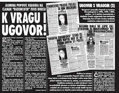 Na ovom mjestu, dakle, imate priliku pročitati kako je novinarka Jasmina Popović sklopila s Croatia osiguranjem ugovor prema kojem se za četiri tisuće kuna mjesečno obavezala da će (o) ovom poduzeću osigurati "pravovremeno pojavljivanje istinitih informacija u medijima". U isto vrijeme, novinarka Popović bila je zaposlena u Večernjem listu, gdje je u vrijeme trajanja ugovora s Croatia osiguranjem objavljivala je razgovore ugodne s tadašnjim direktorom tvrtke Suadom Rizvanbegovićem. O spojivosti ove prakse s novinarskom etikom čitatelji će sami suditi. Također, pročitat ćete i odgovor Jasmine Popović na tekst kojim je Feral problematizirao njezin sukob interesa, a cijeli slučaj zaključen je još jednim tekstom, točnije odgovorom novinara Ivice Đikića na Popovićkino reagiranje.