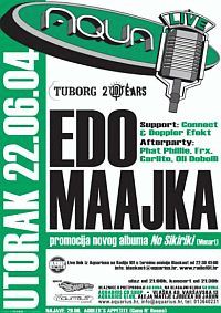 Neusporedivo jeftinija bit će koncertna promocija Ede Maajke, koji će svojoj publici i ostalim znatiželjnicima pokazati kako njegov novi album, "No sikiriki", zvuči uživo. Mjesto tog događanja bit će Aquarius, koji, kako je poznato, utorcima (Aqua Live) organizira, uglavnom odlične koncerte, a baš će u utorak svoje odraditi i neaktivni Lupež Edo. Datum je 22. lipanj i preporučamo da se na obalama Jarunskog jezera nađete već prije 22 sata. Karta u pretprodaji stoji 40 kuna, dok ćete za nju na dan koncerta morati izdvojiti 50 kuna, što je, kako i rekoh, neusporedivo manja suma od one koju ćete morati izdvojiti u Virovitici za Balaša.