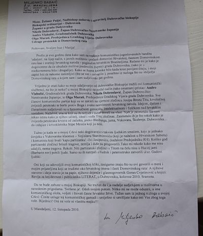 Da ne bude zabune u mojoj Biskupiji. Ne tražim da i ja nadalje sudjelujem u molitvama u navedenim prigodama. 'Svršeno je'. Odoh svojim putom. Nitko mi ne može oduzeti, u ime komunističkog ološa, voljeti i štovati časne hrvatske žrtve. Tužan sam iz jednog razloga u svojoj Crkvi: Činite usluge toj komunističkoj gamadi i smiješno si umišljate kako oni Vas zbog toga vole. Bijednici! Oni ne vole ni vlastitu majku!!!