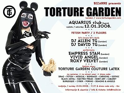 Na tri "floora" nastupaju DJ-evi iz istoimenog londonskog kluba (Torture Garden), a gosti iz Velike Britanije upriličit će i modnu reviju "TG Couture Latex". Svoj osebujni show izvest će performeri Empress Stah, Vivid Angel i Roxy Angel. Organizatori pozivaju goste da ostvare svoje snove, daju si truda i postanu ono o čemu oduvijek maštaju. To, međutim, ne mogu postići u svojoj svakodnevnoj odjeći pa je, osim ulaznica po cijeni 95/120 kuna, uvjet za ulaz u klub zadani "dress code" koji može biti fetish, medical, carnival, gothic, electro freak, cyber ili porno. Naravno, kako to uvijek i biva na ovakvim "kontroverznim" večerima unošenje fotoaparata bit će strogo zabranjeno ...