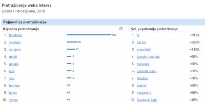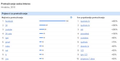U Hrvatskoj, Sloveniji i Bosni i Hercegovini preko Google tražilice ove godine najčešće smo tražili - Facebook. Iznenađujuće dobre rezultate, u smislu zainteresiranosti korisnika interneta, kod kuće postiže zagrebački tabloid 24 sata. Osim liste najtraženijih, naći ćete i listu sve traženijih pojmova, koja će u Hrvatskoj obradovati vlasnike internet oglasnika Njuškalo.