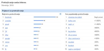 Slovenski internet korisnici poludjeli su za serijalom Slovenija ima talent. Taj se nalazi na listi sve popularnijih pojmova, s opaskom - nagli porast. Zanimljivo je, gotovo nevjerovatno, da se niti na jednoj od tri ljestvice najtraženijih ne nalazi pojam koji asocira na seks. Obraz su nam osvjetlali Bosanci i Hercegovci, kod koji se na ljestvici sve traženijih nalaze - pornići. Svima nam je drag Youtube, a zajedno smo - Hrvati, Slovenci, Bosanci i Hercegovci - dosta tragali i za video igrama. Elem, pogledajte rezultate.