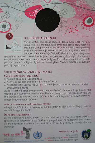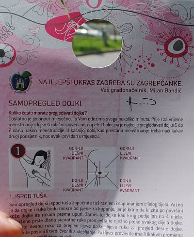 „Ovo je uistinu nevjerojatno“, kaže nam čitatelj koji je jučer na Lupignu redakciju poslao fotografije letka kojeg su Zagrepčani ovih dana dobili u poštanske sandučiće. Letak je poslala udruga Sve za nju, koja okuplja žene oboljele i liječene od raka dojke, te njihove obitelji i prijatelje, a na njemu se objašnjava kako obaviti samopregled dojki. Jasno je kako se radi o vrlo korisnom materijalu koji može pomoći da brojne žene na vrijeme prepoznaju bolest, ali nije jasno iz kojeg razloga na vrhu letka velikim slovima stoji ime Milana Bandića. Naime, kao što se vidi na fotografijama, prije instrukcija o pregledu stoji da su najljepši ukras Zagreba Zagrepčanke, a ispod toga „Vaš gradonačelnik, Milan Bandić“, uz faksimil njegovog potpisa.