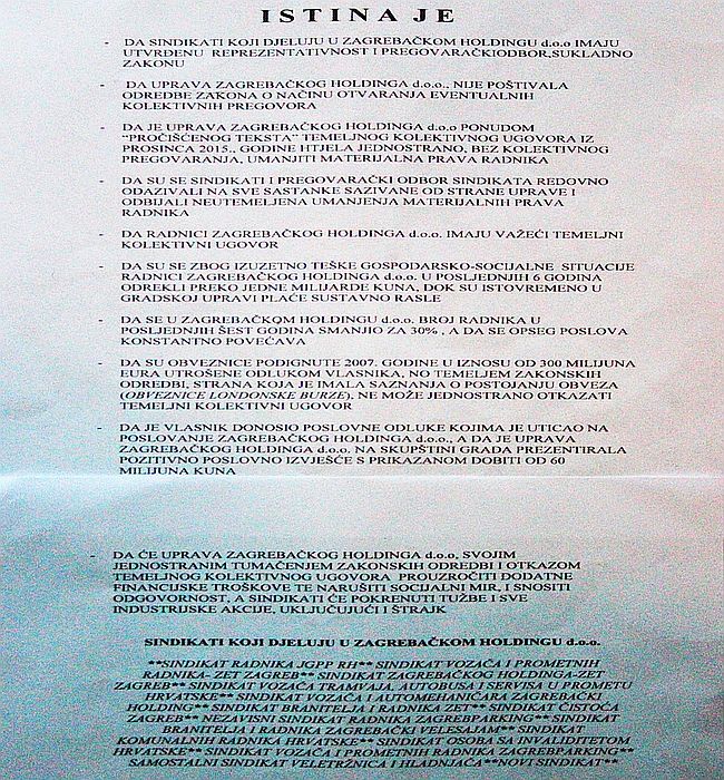 Zastupnica Holdingovih sindikata za odnose s javnošću marketinškoj službi Hanžekovićevog EPH poslala je oglas, koji je u Jutarnjem listu treba biti objavljen na današnji dan. Sindikalni oglas naslovljen je sa "Istina je!", po uzoru na onaj koji je gradonačelnik Milan Bandić svojedobno objavio u svim tiražnijim novinama, uključujući i Jutarnji list, kako bi opravdao krajnje sumnjiv posao kupnje zemljišta Zagrepčanke. Između ostalog, radnički sindikati koji djeluju u Zagrebačkom holdingu u oglasu upozoravaju da uprava njihovog poduzeća, prije jednostranog otkazivanja kolektivnog ugovora, nije poštivala odredbe zakona o načinu otvaranja eventualnih kolektivnih pregovora.