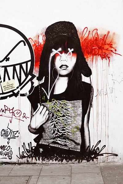 Oštećeni mural djevojčice s majicom Unknown Pleasures, drugog albuma Joy Division - London (FOTO: socapricious.com)