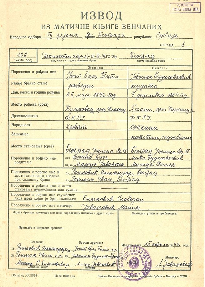 Kako je Josip Broz Tito sebe doživljavao i identificirao? Polako se pomalja odgovor: posve suprotno svim političkim definicijama u Srbiji i Hrvatskoj posljednjih desetljeća. Zato se vjenčani list s Jovankom Budisavljević iz 1952. godine, pričinja kao senzacionalno otkriće jedne dobro čuvane tajne: niti se prilikom ženidbe izjašnjavao kao Jugoslaven, nego Hrvat, niti je svoju školsku spremu obojio klasnim odrednicama bravarskoga radnika. Interpretacija o navodnom otkriću, pak, ništa ne govori o lažnom javnom predstavljanju samoga Josipa Broza.