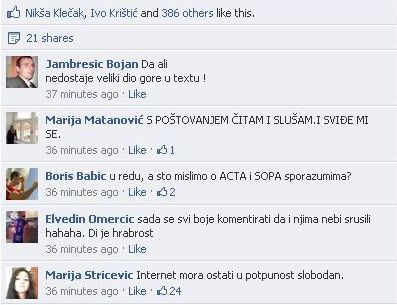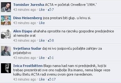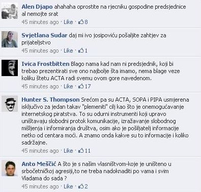 Hrvatski predsjednik Ivo Josipović, čini se, najveći je zagovornik potpisivanja ACTA sporazuma, zbog kojeg postoji realna prijetnja da ćemo izgubiti internet kakav danas poznajemo. Na svom facebook profilu predsjednik je stavio i obrazloženje svog stava, ali onda se dogodilo neočekivano. Njegovi facebook fanovi, koji su do sad za Josipovića uglavnom imali riječi hvale, stali su ga razapinjati kao da se radi o Željku Kerumu, sestri mu Neveki, Milanu Bandiću, Jadranki Kosor... Pogledajte, dakle, kako je dočekano predsjednikovo obrazloženje