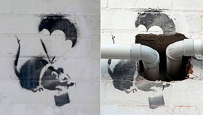 Ovaj rad Banksy je Melbourneu nacrtao još prije 15 godina, a grafit je poznat pod imenom „The Parachuting Rat” i prikazuje, odnosno prikazivao je, štakora s padobranom. Ovih su dana kroz glavu štakora, koji je inače čest motiv u Banksyjevim radovima, građevinari probušili zid i provukli cijevi za toalet kafića koji se gradi s druge strane zida.