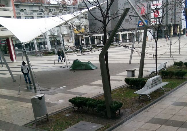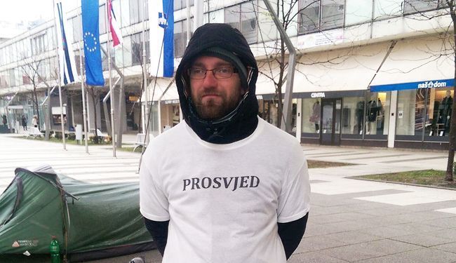 Prosvjeduje tako već mjesecima, ljeti, zimi, svakog dana, čitavog dana, bez svetka i petka, očito oboružan neiscrpnim rezervoarom zen-čamotinje. Nitko ga ne jebe ni dva posto. Na majici mu, naime, ne piše nego 'PROSVJED', pa nije baš jasno protiv čega protestira. Pitao sam ga (za svaki slučaj, za ne stavljati mu značenja u usta) - protiv svega, kaže. Protiv općeg stanja.