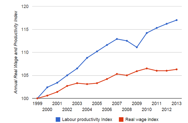 Produktivnost rada, odnosno vrijednost roba i usluga koje radnik proizvede, konstantno raste i uvelike nadilazi rast plaća u razvijenim ekonomijama. To je duži trend koji je zakratko zaustavljen u jeku krize 2008. i 2009. godine. Nesrazmjer između rasta produktivnosti radnika i rasta (odnosno stagnacije) plaća, rezultira smanjenim udjelom rada u BDP-u razvijenih zemalja. Ovaj trend praktički znači da radnici i njihova kućanstva ubiru sve manji dio plodova gospodarskog rasta. Za vlasnike kapitala vrijedi pak obrnuto proporcionalna logika. S manjim udjelom radnika njihova je dobit sve veća, zaključuje izvještaj Međunarodne organizacije rada.