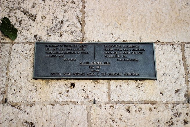 Na fotografiji vidimo ploču postavljenu u Gradu Visu. Ploču je postavila veteranska asocijacija Velike Britanije u spomen na poginule vojnike, koji su se borili i ginuli rame uz rame s Titovim partizanima. Godine 1992., kad je došlo vrijeme da se demokratski mijenjamo, jedan politički nepismen viški domoljub razbio je ovu ploču čekićem. Nekoliko dana iza toga Gradu Visu najavila se delegacija veterana Velike Britanije, koja je najavila da kani položiti vijenac pred spomen pločom. Nastala je strka i panika. Brže bolje u Splitu je naručena rekonstrukcija ploče. Majstori su ploču ponovo izradili, a Grad Vis ju je opet postavio. Britanci su došli, položili vijenac i nisu ništa primijetili. Sramota međunarodnih razmjera je izbjegnuta, barem kad je u pitanju ova ploča. U slučaju ostalih porušenih viških spomenika Grad Vis sramoti se do današnjeg dana.