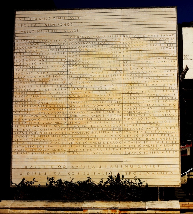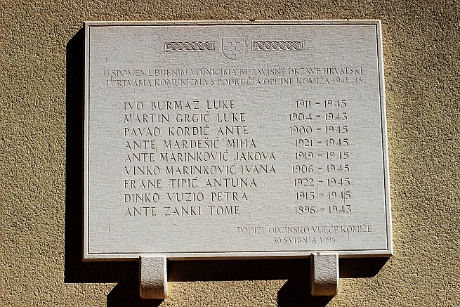 Ovo je druga komiška ploča, koju smo spomenuli u prethodnoj fotografiji. "Trajnije od zapisa u kamenuživjet će u djelu za koje su pali i u srcu naroda", stoji uklesano ponad imena Komižana palih u borbi protiv fašizma. Na koncu se pokazalo da je zapis u kamenu ipak trajniji. Višanima, odnosno onima koji su razbijali viške antifašističke spomenike i spomen-ploče, ova ploča se učinila krupnim zalogajom, ne zbog njezine veličine, nego zbog ovolikog broja uklesanih komiških imena i prezimena.
