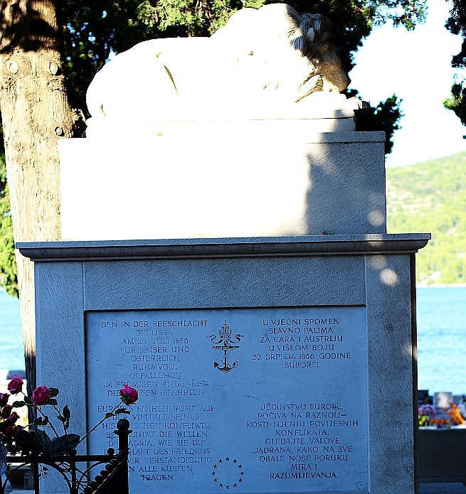 Na ovoj fotografiji vidimo spomenik postavljen u čast Viškoj bitci iz 1866. godine, u kojoj je Austrija naprašila Talijane. Vidimo i poruku koja kaže da jedinstvo Europe počiva na raznolikosti njenih povijesnih konflikata. Razmislite još jednom o ovoj poruci: Jedinstvo Europe počiva na raznolikosti njenih povijesnih konflikata! Zar nije urnebesna?