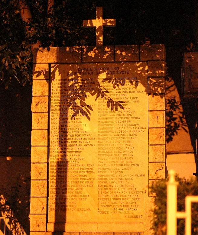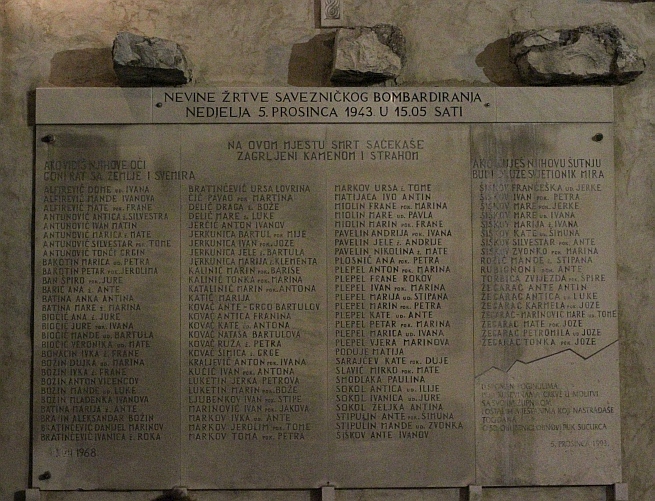 Ova spomen ploča također se nalazi u Kaštel Sućurcu. Na njoj su imena ljudi poginulih u savezničkom bombardiranju lokalne crkve. Spomenik je podignut 1968. godine. Čekićem i dlijetom je u donjem lijevom kutu izbrisano tko diže spomenik. U donjem desnom kutu vidimo komad ploče nakalemljen 1993. godine. Demokrati naprosto nisu mogli izdržati da se ne potpišu.