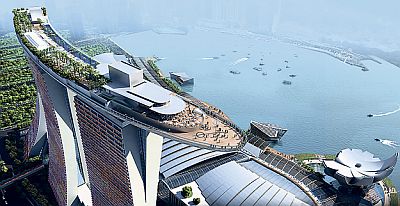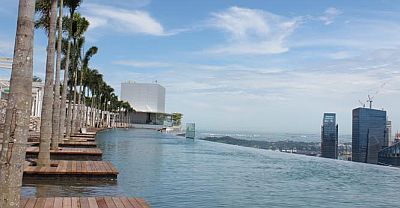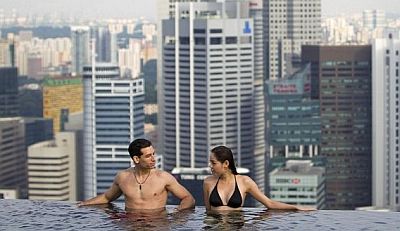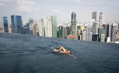 Tamo gdje je veliki grijeh baciti papirić na ulici, ovoga je tjedna otvoren luksuzni hotel „Marina Bay Sands“ u koji je utučeno nevjerojatnih četiri milijarde eura, što je otprilike četiri puta više nego li iznosi godišnji proračun Grada Zagreba. Dobar dio tog iznosa utrošen je na svod koji spaja tri hotelska nebodera od 55 katova u kojima je smješteno dvije i pol tisuće soba. Na tih dvije stotine metara nad gradom pronašao se bazen dugačak, ili bolje rečeno, golem, impresivnih 150 metara.