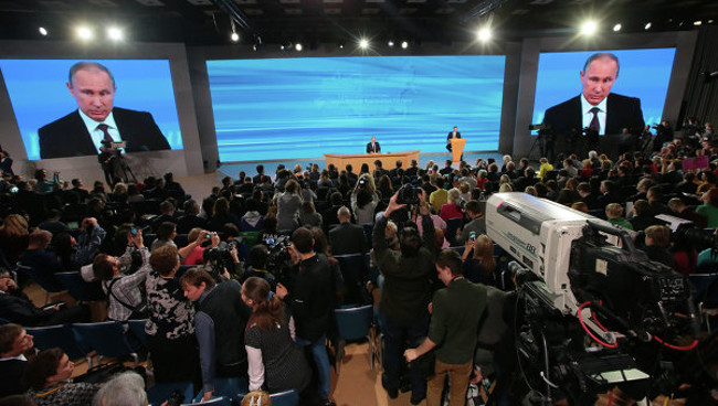 Ruski predsjednik Vladimir Putin održao je već tradicionalnu maratonsku trosatnu godišnju konferenciju za novinare u Moskvi pred gotovo 1.400 akreditiranih novinara. Pred sam početak događanja skinuo je sat s ruke i odložio ga strane nakon čega je s vidiljivim zadovoljstvom odgovarao je na novinarska pitanja vezana za vanjsku i unutarnju rusku politiku, uživajući u stalnoj konsternaciji novinara koju su izazivali njegovi odgovori.