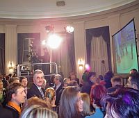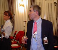 Jedna grupica spontano je zaskandirala "Mi-la-ne, Mi-la-ne!", što nije prihvaćeno od ostatka dvorane. Ipak se te večeri uglavnom skandiralo "Sti-pe, Sti-pe!". Gradski i nacionalni esdepeovci gledali su da se baš ne druže s ekipom iz HNS-a, i obratno. Tako su samoražalovani Srećko Ferenčak i megafon stranke Boris Blažeković uglavnom pribivali u dvorani za novinare, dok su se esdepeovci tiskali s ostalom rajom. Evo nam na fotografiji i gospodina Hrvoja Sontakija, prvoborca za Mesićevu karijeru na Pantovčak, kojeg smo pobliže opisali (tko je i što radi) u prošlom javljanju iz Stožera izbornog pobjednika. Za ovu priliku Sontaki je obukao i kravatu s Mesićevim likom, a, inače se, uglavnom pravio da ne pozna Lupiginog izvještača. No, ne vjerujemo da se radi o gizdavosti, nego o činjenici da takav ugostitelj dnevno upozna barem pedeset novinara i podijeli isto toliko vizitki svog "Kitokreta".