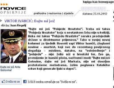 Brojne reakcije izazvao je i tekst Viktora Ivančića, „Dajte mi još“, koji smo kao i sve kolumne ovoga autora u dogovoru s uredništvom tjednika Novosti objavljivali kao najavu svakog novog broja najboljeg tjednika u regiji. U tom je tekstu ovaj zloglasni novinar - anarhist, koji sve donedavno nije želio ući u „hrvatski tor“, promijenio ploču te kumio i molio: "Dajte mi još Gotovine, dajte mi još Markača, nije mi dovoljno protokolarne melodrame, želim poglavara Katoličke crkve koji generale ljubi u dupe!". Veliku čitanost zabilježio je i tekst „NIKOLA TESLA: Radim na stroju za uništavanje brodova s ogromnih udaljenosti!“, a zapravo se radi o zabilješkama velikana kiparstva, Ivana Meštrovića, koji je svoj susret s velikim izumiteljem opisao u biografskoj knjizi "Uspomene na političke ljude i događaje". Tesla mu je, među ostalim, objasnio kako su ga pokrali Edison i Marconi i kako radi na stroju za uništavanje brodova s velikih daljina.