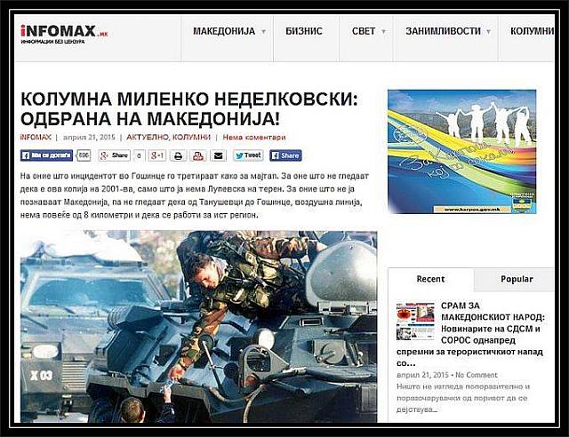 Kakvim su hajkama novinari i novinarke u Makedoniji izloženi, nerijetko i od strane kolega i kolegica iz provladinih medija, najbolje govori tekst provladinog novinara Milenka Nedelovskog, koji nema problema s dobivanjem intervjua od premijera Gruevskog. Kolumna je objavljena na portalu Infomax.mk, a proziva novinare koji su prokazali navodni teroristički napad koji se dogodio u noći sa nedjelje na ponedjeljak.