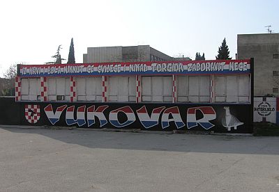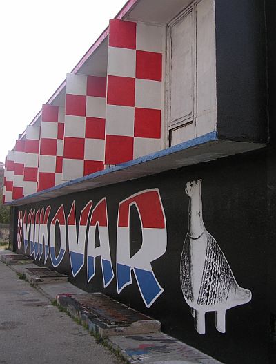 Istočni zid iste dvorane posvećen je gradu heroju na kojega krotkim pogledom motri vučedolska golubica. Zapravo se radi o jarebici, međutim ...