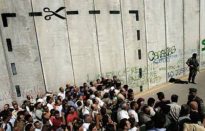 Ramallah, Jeruzalem, "ovdje reži" poznati znak s robnih proizvoda naslikan na zidu koji dijeli