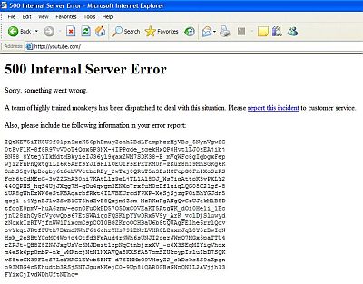 S obzirom da se s YouTubea nisu oglasili u svezi nemilog incidenta, preostaje nam da s obzirom na sadržaj poruke, pretpostavimo kako je riječ o napadu crackera. U nastavku ostavljene poruke, koji smo naveli u uvodu, savjetuje se da korisnici odgovornima prijave "incident", te je umetnut i niz slova i brojeva, što je kod koji nama običnim smrtnicima ne znači apsolutno ništa. Inače, ovakav slučaj događao se na istom mjestu već nekoliko puta, a što bi mogao biti razlog eventualnog napada, nije nam poznato. Kako je, dakle, jučer izgledala stranica tog portala doznajte iz priloženog screenshota ...