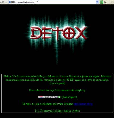 Uz svoj logo, Detox je na www.taxi-cammeo.hr ostavio i sljedeću poruku: „Nakon 30-ak poziva na vašu službu, poslali ste mi 5 taxi-a. Naravno ni jedan nije stigao. Medutim na kraju mjeseca sam dobio/la tel. racun koji je iznosio 43 KN samo na pozive za vašu službu.(Lopovi jedni)“. Osim toga posjetiteljima Cammeovog weba preporučio je da ukoliko im zatreba taxi nazovu telefonski broj 060 800 800, što je kontakt Radio Taxi Zagreba, koji će od prosinca također bitno spustiti cijene svojih usluga i biti značajna konkurencija Cammeu.