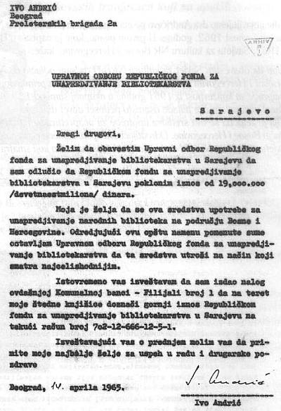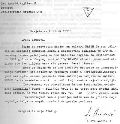 Nagradu je odlučio pokloniti unaprjeđenju bosanskohercegovačkog bibliotekarstva. U pismu koje je u svibnju 1962. godine uputio Savjetu za kulturu Bosne i Hercegovine stoji: „Želim da obavijestim Savjet za kulturu NR Bosne i Hercegovine da sam odlučio da Narodnoj Republici Bosni i Hercegovini poklonim pedeset posto iznosa primljenog na ime Nobelove nagrade. Moja je želja da se ova sredstva upotrijebe za unaprjeđenje narodnih biblioteka na području Bosne i Hercegovine“. Kasnije je Andrić u istu svrhu poklonio i ostatak novca, a što je rekao u svome govoru pročitajte u nastavku …