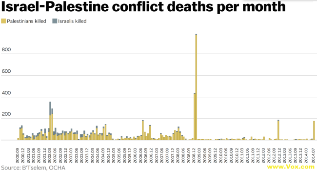 Broj ubijenih od 2000. do 2014. godine: Plestinci su označeni žutom, Izraelci plavom bojom