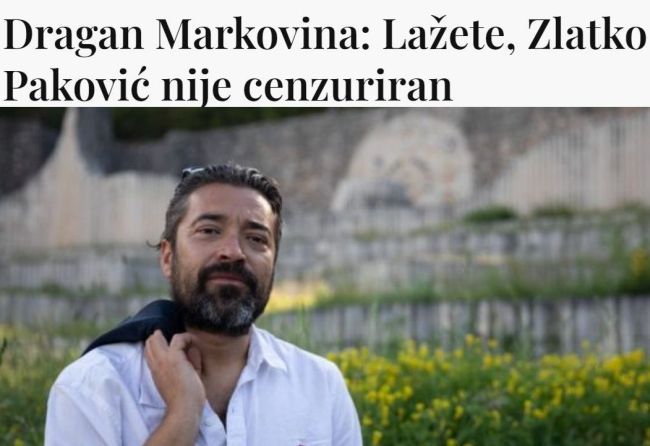 Povjesničar i pisac Dragan Markovina spomenuo me imenom i prezimenom u svojoj kolumni na portalu Tačno, pod naslovom - "Lažete, Zlatko Paković nije cenzuriran". Volio bih da me nije spominjao. Bilo bi bolje i za njega i za mene da nije. U Markovininu kolumnu dospio sam pod optužbom za suučesništvo u proizvodnji "lažnog skandala o navodnoj zabrani Pakovićeve predstave". Radi se o tome da je Markovina poželio u kazalištu uprizoriti svoj roman "14. februar 1945.", koji je posvetio Danu oslobođenja Mostara od fašizma u Drugom svjetskom ratu. Za redatelja i dramaturga odabrao je Zlatka Pakovića, a produkciju je dogovorio s Narodnim pozorištem Mostar, Pozorištem lutaka u Mostaru i Mostarskim teatrom mladih. Hrvatsko narodno kazalište Mostar također je pozvano u koprodukciju, ali odbili su sudjelovati. Zbog stanovitih pritisaka, nesporazuma i ishitrenosti u komunikaciji u pripremi predstave došlo je do kuršlusa i rad na predstavi je obustavljen. Zlatko Paković sad smatra i tvrdi da je predstava zabranjena, a Dragan Markovina tvrdi da nije. Pukla je bruka, puklo je prijateljstvo, došlo je do međusobne razmjene vatre.
