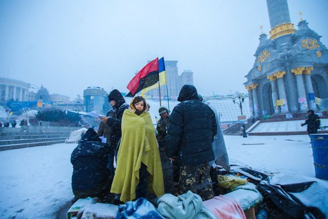 U novogodišnjoj noći, na dočeku 2014. godine, na Maidanu Nezaležnosti, središnjem trgu u Kijevu, okupilo se najmanje stotinu tisuća ljudi. Još uvijek je to bila nevina revolucija. Iako su se prosvjednici kroz cijeli prosinac povremeno sukobljavali s policijom, u uličnim obračunima nije bilo mrtvih. Trg se u protekla dva mjeseca više zabavljao, nego "ratovao". Prosvjednike su zabavljale glazbene zvijezde, nastupali su gostujući i domaći govornici, aktivisti, osobe iz javnog života, političari iz susjednih zemalja i Europske unije. Prosvjednici su imali tri zahtjeva: tražilo se osnivanje koordinacijskog tijela za komunikaciju s EU, od državnih organa gonjenja zahtijevala se istraga svih slučajeva nasilja nad aktivistima i sudionicima Maidana, a od predsjednika Viktora Janukoviča i njegove vlade tražila se ostavka.